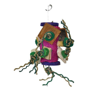 The fun spongy bird toy is fun toy for shredding, tearing and chewing made with wood, cuttlebone, bamboo, coconut and loofa