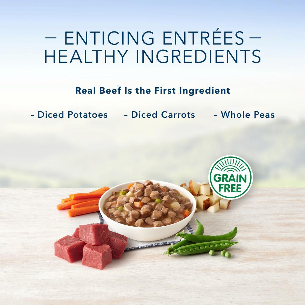 Beef, Beef Broth, Water, Chicken Liver, Carrots, Chicken, Potatoes, Dried Egg, Peas, Pea Flour, Potato Starch, Guar Gum, Natural New York Strip Flavor, Salt, Sodium Phosphate, Cane Molasses, Potassium Chloride, Calcium Carbonate, Choline Chloride, Zinc Amino Acid Chelate, Iron Amino Acid Chelate, Xanthan Gum, Vitamin E Supplement, Copper Amino Acid Chelate, Manganese Amino Acid Chelate, Sodium Selenite, Thiamine Mononitrate (Vitamin B1), Cobalt Amino Acid Chelate, Niacin Supplement (Vitamin B3), Calcium Pantothenate (Vitamin B5), Vitamin A Supplement, Riboflavin Supplement (Vitamin B2), Biotin (Vitamin B7), Vitamin B12 Supplement, Potassium Iodide, Pyridoxine Hydrochloride (Vitamin B6), Vitamin D3 Supplement, Folic Acid (Vitamin B9).