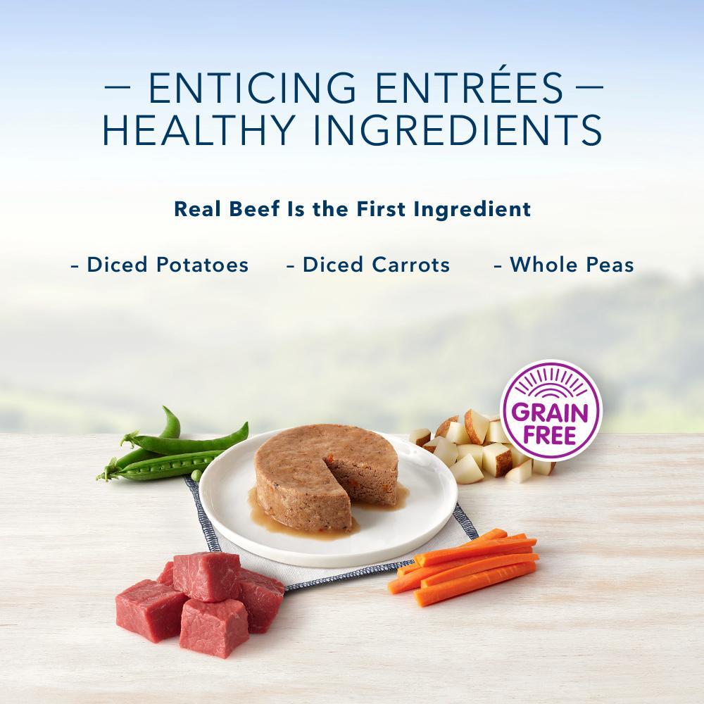 Beef, Chicken, Beef Broth, Potatoes, Chicken Liver, Carrots, Peas, Carrageenan, Flaxseed, Guar Gum, Natural Top Sirloin Flavor, Cassia Gum, Potassium Chloride, Salt, Zinc Amino Acid Chelate, Iron Amino Acid Chelate, Choline Chloride, Vitamin E Supplement, Copper Amino Acid Chelate, Manganese Amino Acid Chelate, Sodium Selenite, Thiamine Mononitrate (Vitamin B1), Cobalt Amino