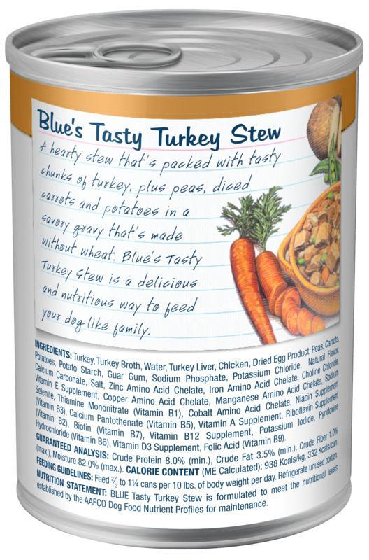 Formulated to meet the nutritional requirements of adult dogs, each Blue’s Stew wet dog food recipe features high-quality protein from real turkey to help provide your dog with the energy he needs for a healthy, active life.