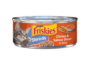 Get your cat purring for the taste of Purina Friskies Shreds Chicken & Salmon Dinner in Gravy wet cat food. Real chicken delivers the tantalizing flavor your cat craves, while the shredded texture in each serving is tender to the tooth. Each bite contains savory gravy, adding another layer of delight to this irresistible wet cat food. Since this meal is packed with essential vitamins and minerals, you can rest easy knowing your cat is enjoying a high-quality meal backed by a trusted brand. Make this Purina Friskies wet cat food part of your cat's complete and balanced diet, and alternate between wet and dry foods by giving your cat the palate-pleasing tastes and textures of Purina Friskies Tender & Crunchy Combo dry cat food. We believe life is better with pets, so we work to create meals that are safe, delicious and nutritious for your cat. We make quality the top priority in everything we produce, and our team of experts formulates this recipe to meet or exceed industry standards for cat food. Because you care about where your cat's meals come from, we're proud to produce this wet cat food in our Purina-owned U.S. facilities. Every batch undergoes hourly safety and quality checks to give you added peace of mind each time you serve this recipe to your cat companion. We also value sustainability, which is why we seek out responsibly sourced ingredients and eco-friendly packaging options whenever possible. Every can of this Purina Friskies variety is recyclable, allowing you to have a positive impact on the environment while giving your cat the savory meals she craves. Offer her Purina Friskies Shreds Chicken & Salmon Dinner in Gravy wet cat food every day to let her know she's an important part of your life.