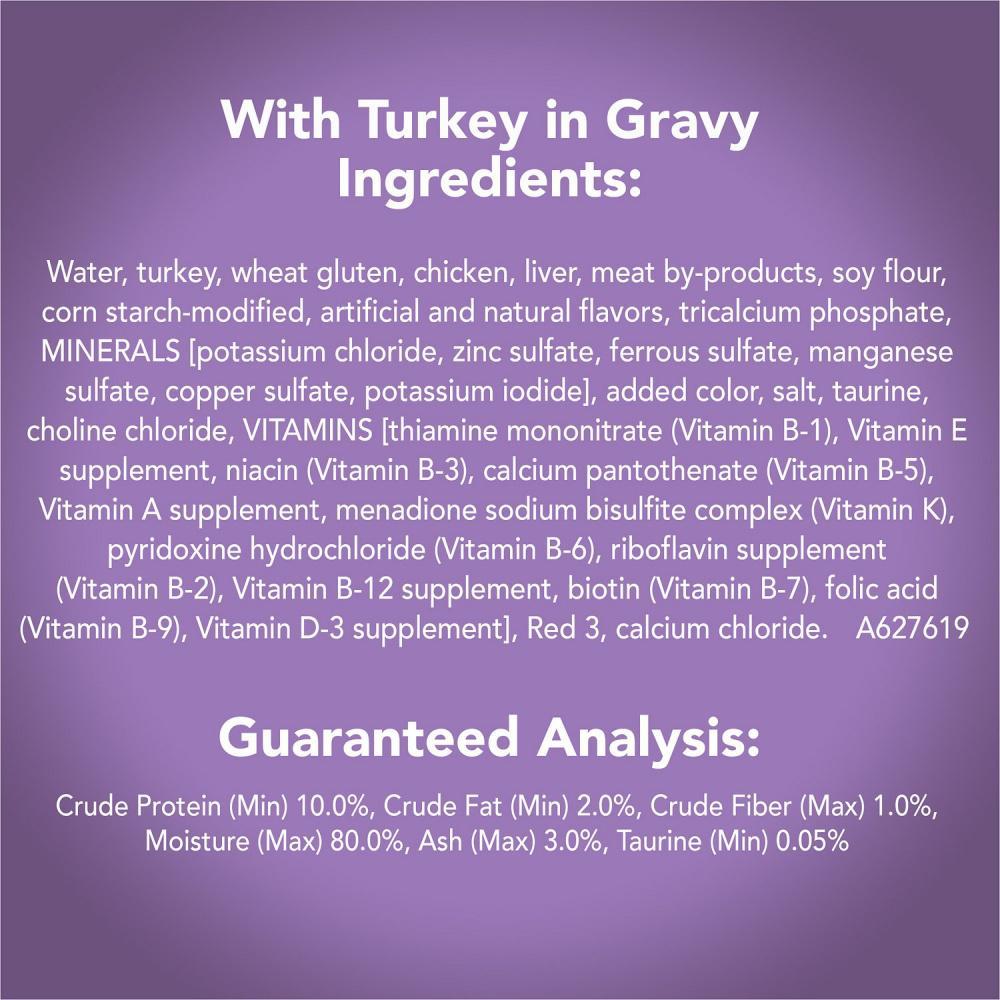 Water, Turkey, Liver, Wheat Gluten, Meat By-Products, Vegetable Starch-Modified, Soy Flour, Artificial And Natural Flavors, Cheese, Sodium Caseinate, Vegetable Oil, Minerals [Potassium Chloride, Zinc Sulfate, Ferrous Sulfate, Manganese Sulfate, Copper Sulfate, Potassium Iodide], Added Color, Tricalcium Phosphate, Corn Starch, Salt, Dried Whey, Taurine, Choline Chloride, Vitamins [Thiamine Mononitrate (Vitamin B-1), Vitamin E Supplement, Niacin (Vitamin B-3), Calcium Pantothenate (Vitamin B-5), Vitamin A Supplement, Menadione Sodium Bisulfite Complex (Vitamin K), Pyridoxine Hydrochloride (Vitamin B-6), Riboflavin Supplement (Vitamin B-2), Vitamin B-12 Supplement, Biotin (Vitamin B-7), Folic Acid (Vitamin B-9), Vitamin D-3 Supplement], Sorbic Acid (A Preservative).