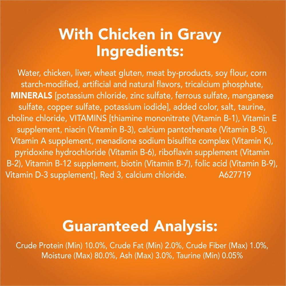 Water, Chicken, Liver, Wheat Gluten, Meat By-Products, Vegetable Starch-Modified, Soy Flour, Cheese, Artificial And Natural Flavors, Tricalcium Phosphate, Sodium Caseinate, Vegetable Oil, Corn Starch, Minerals [Potassium Chloride, Zinc Sulfate, Ferrous Sulfate, Manganese Sulfate, Copper Sulfate, Potassium Iodide], Added Color, Salt, Dried Whey, Taurine, Choline Chloride, Vitamins [Thiamine Mononitrate (Vitamin B-1), Vitamin E Supplement, Niacin (Vitamin B-3), Calcium Pantothenate (Vitamin B-5), Vitamin A Supplement, Menadione Sodium Bisulfite Complex (Vitamin K), Pyridoxine Hydrochloride (Vitamin B-6), Riboflavin Supplement (Vitamin B-2), Vitamin B-12 Supplement, Biotin (Vitamin B-7), Folic Acid (Vitamin B-9), Vitamin D-3 Supplement], Sorbic Acid (A Preservative).