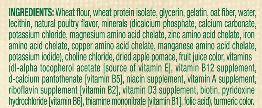 Gelatin, Wheat Protein Isolate, Glycerin, Soy Protein Isolate, Sodium Caseinate, Natural Poultry Flavor, Hydrogenated Starch Hydrolysate, Vegetable Oil (Preserved with Propyl Gallate), Sodium Tripolyphosphate, Lecithin, Ground Flaxseed, Calcium Carbonate, Magnesium Monostearate, Monoglycerides of Edible Fatty Acids, Choline Chloride, Potassium Sorbate (A Preservative), Minerals (Magnesium Oxide, Zinc Sulfate, Ferrous Sulfate, Copper Sulfate, Maganese Sulfate, Potassium Iodide), Vitamins (dl-Alpha Tocopherol Acetate [source of Vitamin E], Vitamin B12 Supplement, Calcium Pantothenate, Niacin Supplement, Vitamin A Supplement, Riboflavin Supplement, Vitamin D3 Supplement, Biotin, Pyridoxine Hydrochloride [Vitamin B6], Thiamine Mononitrate [Vitamin B1], Folic Acid), Chlorophyll.