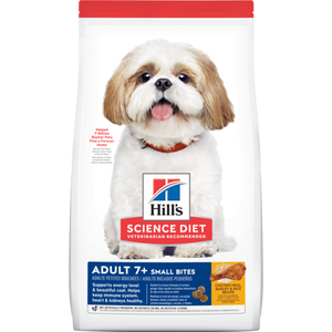 Hill's® Science Diet® Adult 7+ Small Bites dry dog food is formulated for specific aging needs. Provides easy-to-digest nutrition with a synergistic blend of ingredients to help support energy & activity level.  Delicious chicken flavor in a small bite size for those that prefer variety.