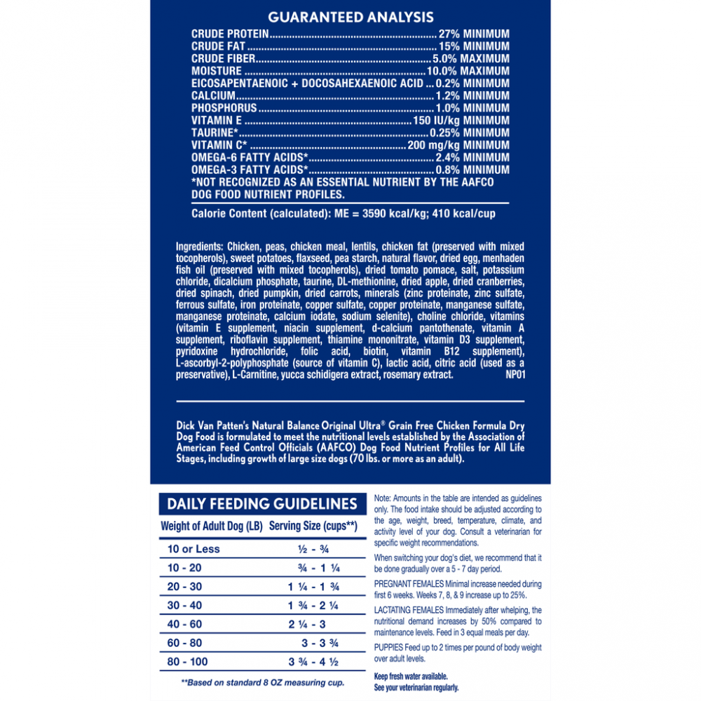 Chicken, Peas, Chicken Meal, Lentils, Chicken Fat (Preserved with Mixed Tocopherols), Sweet Potatoes, Flaxseed, Pea Starch, Natural Flavor, Dried Egg, Menhaden Fish Oil (Preserved with Mixed Tocopherols), Dried Tomato Pomace, Salt, Potassium Chloride, Dicalcium Phosphate, Taurine, Dl-methionine, Dried Apple, Dried Cranberries, Dried Spinach, Dried Pumpkin, Dried Carrots, Minerals (Zinc Proteinate, Zinc Sulfate, Ferrous Sulfate, Iron Proteinate, Copper Sulfate, Copper Proteinate, Manganese Sulfate, Manganese Proteinate, Calcium Iodate, Sodium Selenite), Choline Chloride, Vitamins (Vitamin E Supplement, Niacin Supplement, D-calcium Pantothenate, Vitamin A Supplement, Riboflavin Supplement, Thiamine Mononitrate, Vitamin D3 Supplement, Pyridoxine Hydrochloride, Folic Acid, Biotin, Vitamin B12 Supplement), L-ascorbyl-2-polyphosphate (Source of Vitamin C), Lactic Acid, Citric Acid (Used As A Preservative), L-carnitine, Yucca Schidigera Extract, Rosemary Extract.