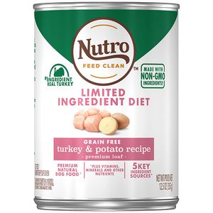 Your dog won’t be able to resist getting their paws on a can of NUTRO™ Limited Ingredient Diet Turkey & Potato Recipe Adult Dog Food. Farm-raised turkey is the first ingredient in this wet food designed for dogs with food sensitivities. This grain-free canned wet dog food is made with natural ingredients plus vitamins, minerals, and other nutrients, and is full of flavor that adult dogs big and small go crazy for. This NUTRO recipe is made with non-GMO ingredients†, NO corn, wheat, or soy, NO chicken by-product meal, and NO artificial preservatives, flavors, or colors. Plus, it’s made at facilities committed to zero waste to landfill. Give your dog NUTRO Limited Ingredient Diet recipes with the NUTRO FEED CLEAN logo every day for ultimate tail wags.
