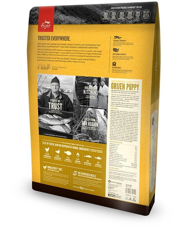 Biologically appropriate grain free dog food with the highest quality deboned chicken, deboned turkey, yellowtail flounder, whole eggs, whole atlantic mackerel, and more locally sourced meats, fruits and vegetables make this food the tastiest and healthiest food for all four-legged taste testers. Puppies require a diet rich in proteins and fats from a variety of fresh whole meats to fully support their rapid growth and development. ORIJEN Puppy Dry Dog food contains 85% poultry, fish and eggs, 15% fruits and vegetables, and 0% grains, potatoes, or plant proteins. ORIJEN’s Puppy Recipe Dry Dog Food is sustainably farmed, and is so fresh, it’s actually rated for human consumption.