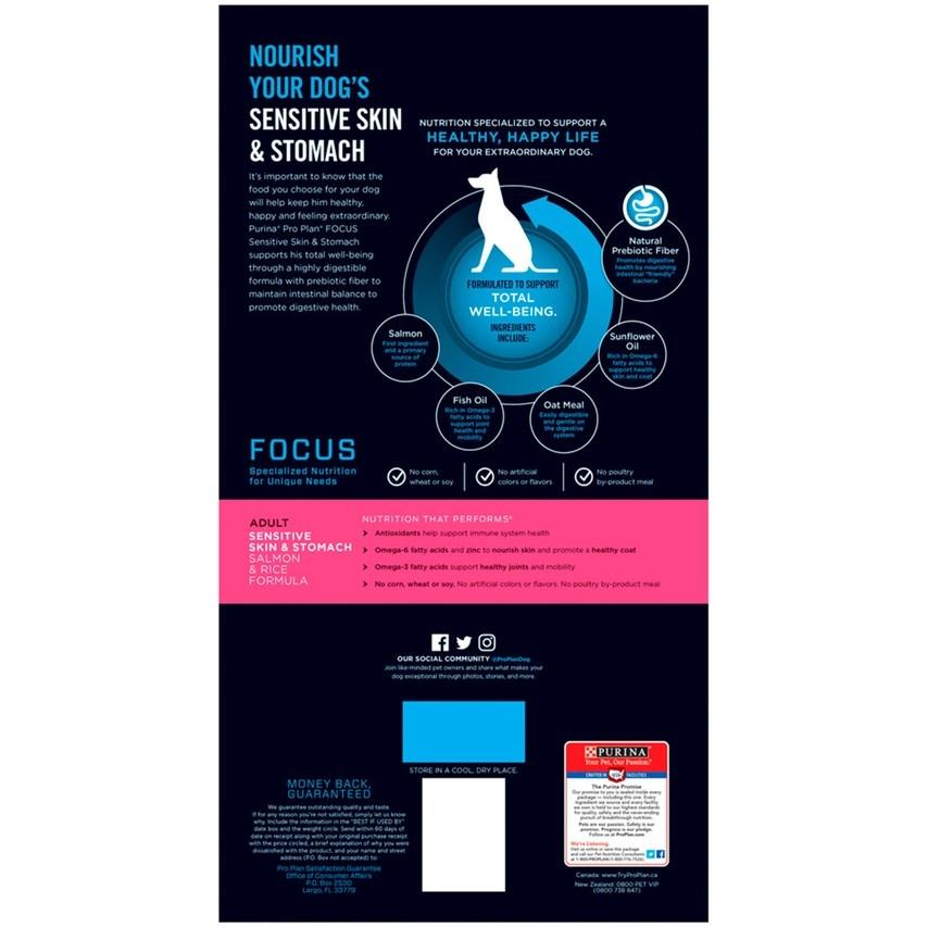 Nurture your dog's sensitive skin and stomach with Purina Pro Plan FOCUS Sensitive Skin & Stomach Salmon & Rice Formula adult dry dog food. Nutrient-rich salmon is the first ingredient and a primary source of protein in this formula. Also containing prebiotic fiber, this dog food for sensitive stomach boasts a highly-digestible formula that nourishes the beneficial bacteria found in your dog's intestine, helping to promote his digestive health. Ingredients such as rice and oatmeal provide easily digestible sources of carbohydrates for your dog. Meanwhile, fish oil -- a source of EPA, one of the omega-3 fatty acids -- helps support healthy joints and mobility, while omega-6 fatty acids and zinc nourish your dog's skin and keep his coat looking healthy. There is also no corn, wheat or soy in our Sensitive Skin & Stomach Formula. It's important to know the food you choose for your dog will help keep him healthy, happy and feeling extraordinary, and that's what Purina Pro Plan FOCUS Sensitive Skin & Stomach Salmon & Rice Formula adult dry dog food does.