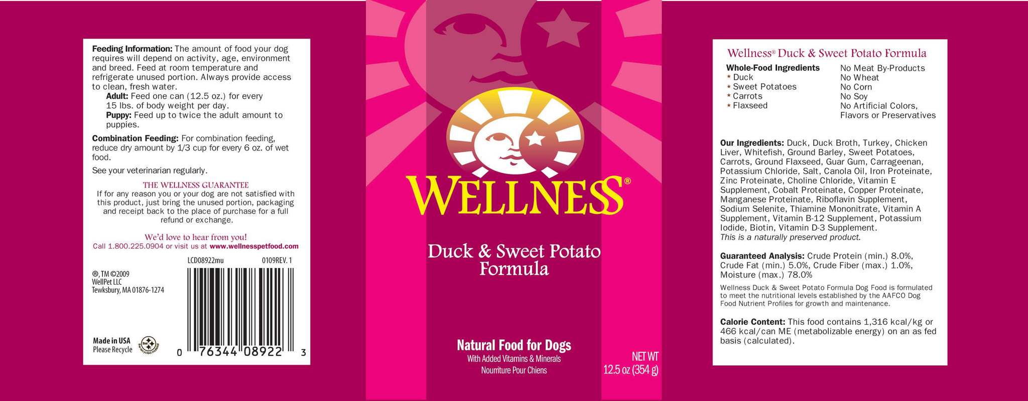 Duck, Duck Broth, Turkey, Chicken Liver, Ground Barley, Sweet Potatoes, Carrots, Carrageenan, Ground Flaxseed, Potassium Chloride, Ocean Whitefish, Guar Gum, Salt, Canola Oil, Iron Proteinate (Source Of Chelated Iron), Zinc Proteinate (Source Of Chelated Zinc), Choline Chloride, Vitamins A, E And D3 Supplements, Manganese Proteinate (Source Of Chelated Manganese), Riboflavin Supplement, Sodium Selenite, Thiamine Mononitrate, Vitamin B-12 Supplement, Potassium Iodide, D-Biotin.