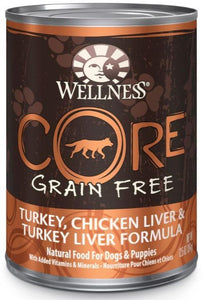 Wellness CORE Grain-free Natural Turkey, Chicken and Turkey Liver Recipe Wet Canned Dog Food is rich in protein, free of grains and is supplemented with salmon oil and cranberries to help support your dogs inner health. If you've been looking for a great and healthy canned food give this one a try! Your dog is sure to love it.