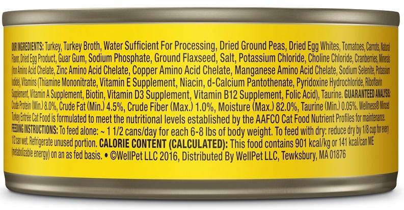 Wellness Grain-free Natural Minced Turkey Recipe Wet Canned Cat Food is made of tasty Bits in a Light Gravy which include natural, wholesome ingredients with no added artificial colors, flavors or preservatives. This dinner is a great way to add some variety to your cat’s diet, in addition to providing an additional source of water for healthy hydration!